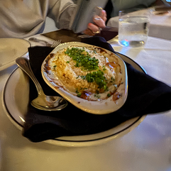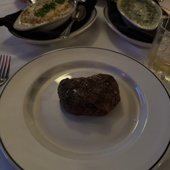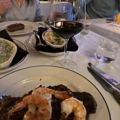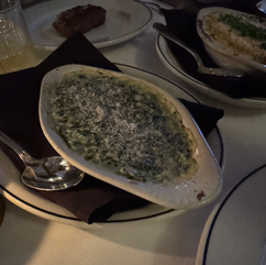 with grilled shrimp. By this point, we had struck up a conversation with the couple dining merely nine inches from us, so the focus was hard to hold. As professionals, we pushed through. My steak was cooked perfectly and shrimp was nice. I will say, the flavor of the steak was good, but not the best steak I have ever had. Same with the shrimp, technically almost perfect, taste-wise just a little less than I was hoping. Cindy's steak was cooked as requested too. We both ended up boxing our steaks for next day breakfast. For sides we ordered the creamed spinich as well as the au gratin potatoes. Both were solid choices and I would choose the spinich again.
