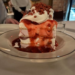 Finally, we couldn't pass up dessert! We chose the strawberry ice cream cake. Now, I have always heard people joke and say, "Life is short, eat dessert first." I wouldn't care if I could live forever, I would order this cake ten thousand times over and start every meal with it! Of course, the presentation was dramatic and the sheer massive size is stunning. We felt like we could easily...and I mean easily cut this thing in fourths or even sixths and share it! That being said, we cut two pieces from the mammoth mound of strawberry ice cream ladened cake with refreshing dried strawberries and fresh cream on top. This was something you don't want to sleep on...AT ALL!